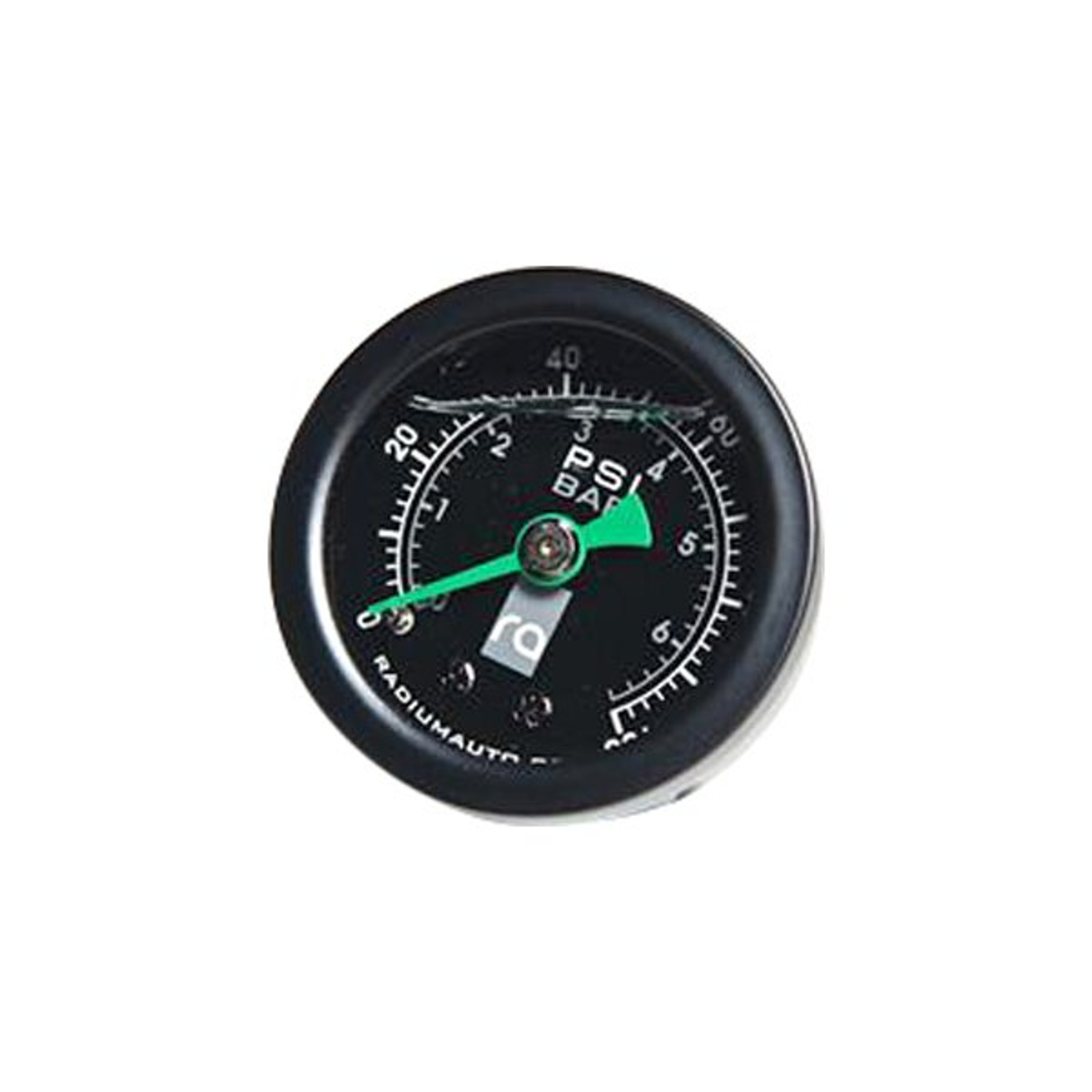 Radium Fuel Pressure Gauge with 6AN Inline Adapter Universal Fuel Pressure Gauge (20-0152) by Radium. This high-accuracy fuel pressure gauge is suitable for all fueling applications. It features an acrylic lens with a silicone filled dial that reads from 0 to 100psi (0 to 6.9 BAR) with +/- 2% accuracy. Silicone fluid prevents the needle from vibrating for easy pressure readings. The internal bubble is normal. Comes with -6AN Adapter.